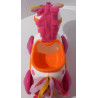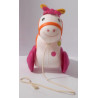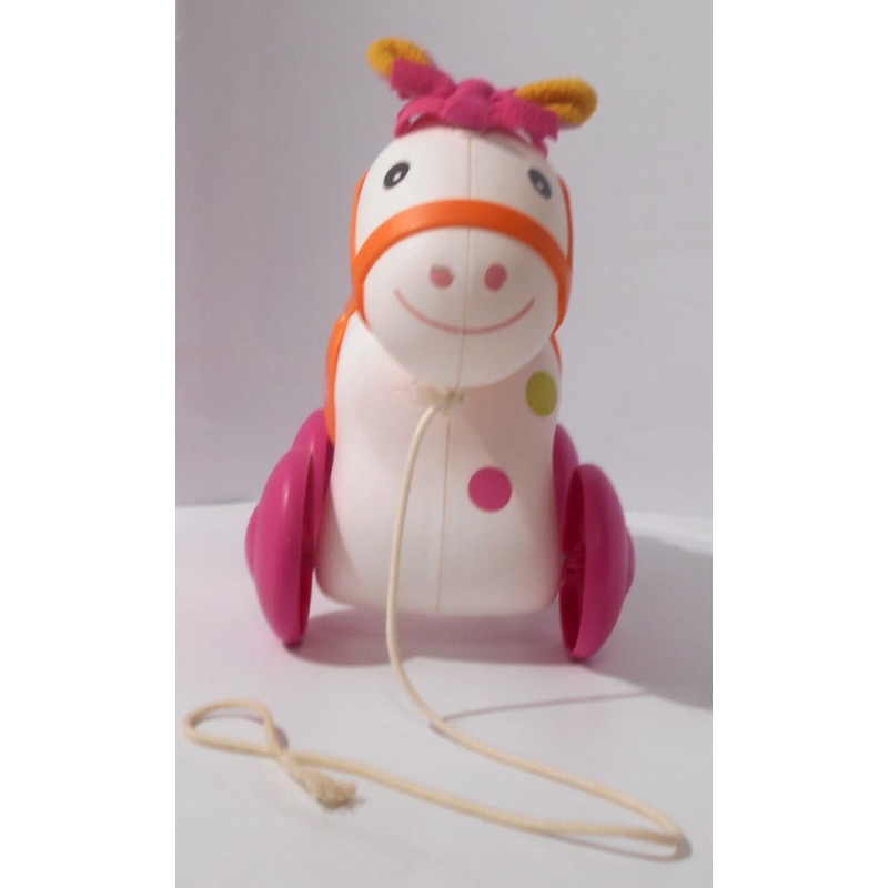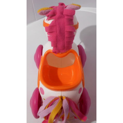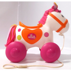 Petit cheval dans lequel vous pouvez mettre une poupée, les roues arrières du cheval permettant au poupon d'imiter le mouvement d'un cavalier.