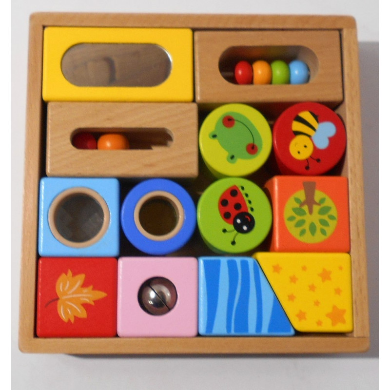 Cubes en bois avec miroirs , grelet, couleurs , animaux de différentes formes.