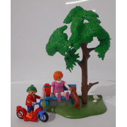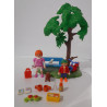 Le set contient : une maman et son petit garçon, un chien, un pigeon, un cabas, une trottinette, un banc , une brique de jus de fruits, une bouteille d'eau, une boîte à sandwichs, deux crème glacées, deux pommes, deux tasses avec anses.